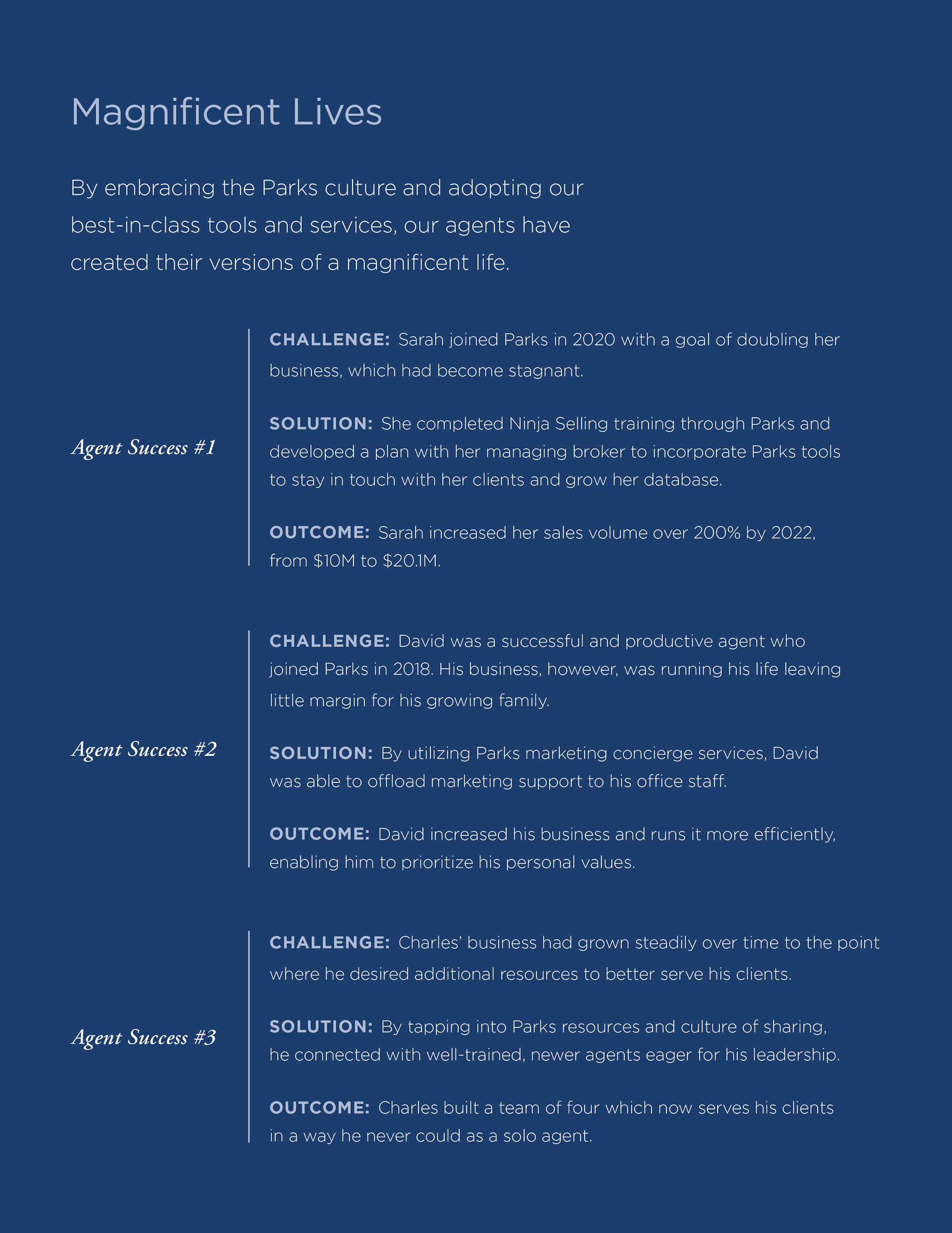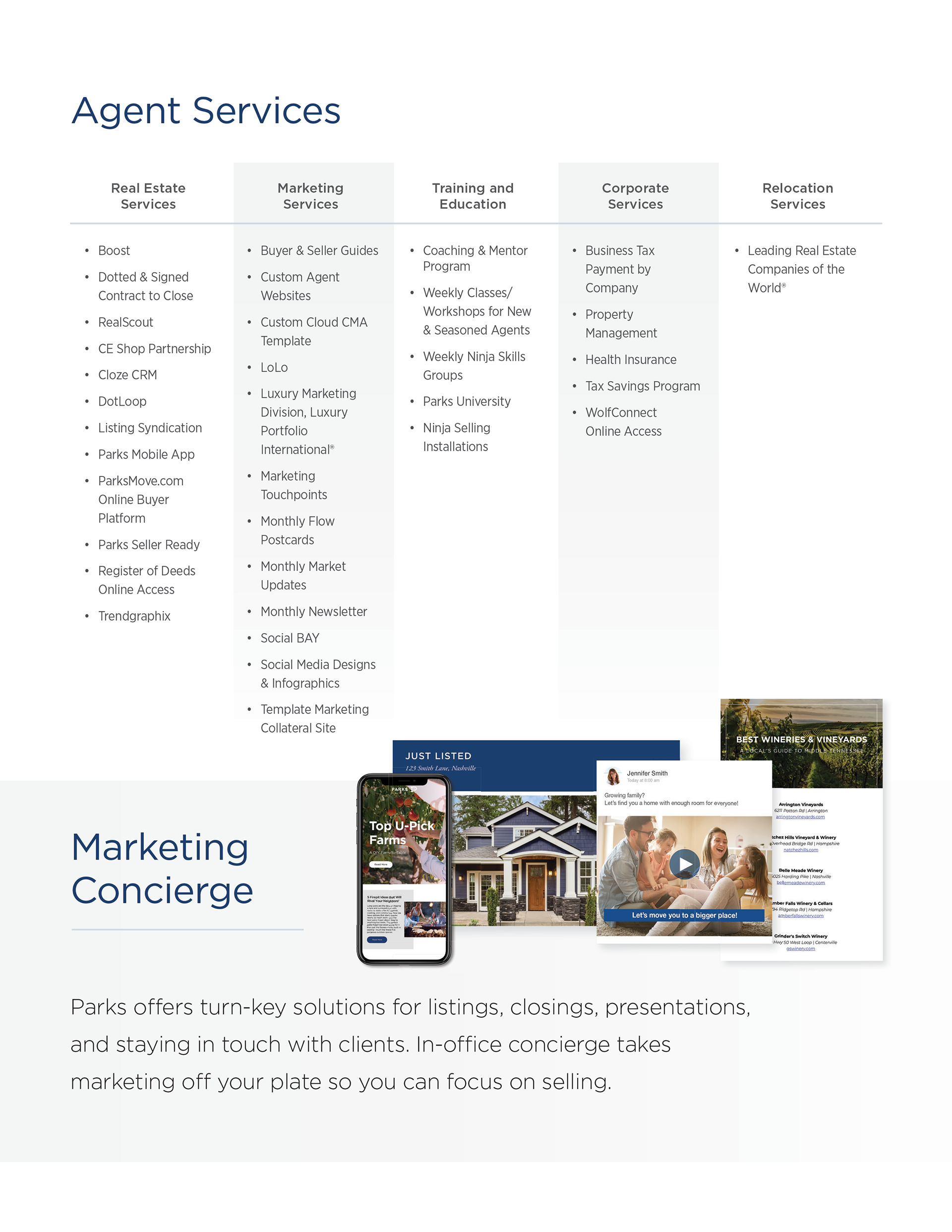 Create a range of printed and digital recruitment materials that highlight Parks' key differentiators—personalized support, a competitive tech stack, and a strong network of top-producing agents. For each stage in the recruitment process and agent interest level, there would be a corresponding print or digital supplement.