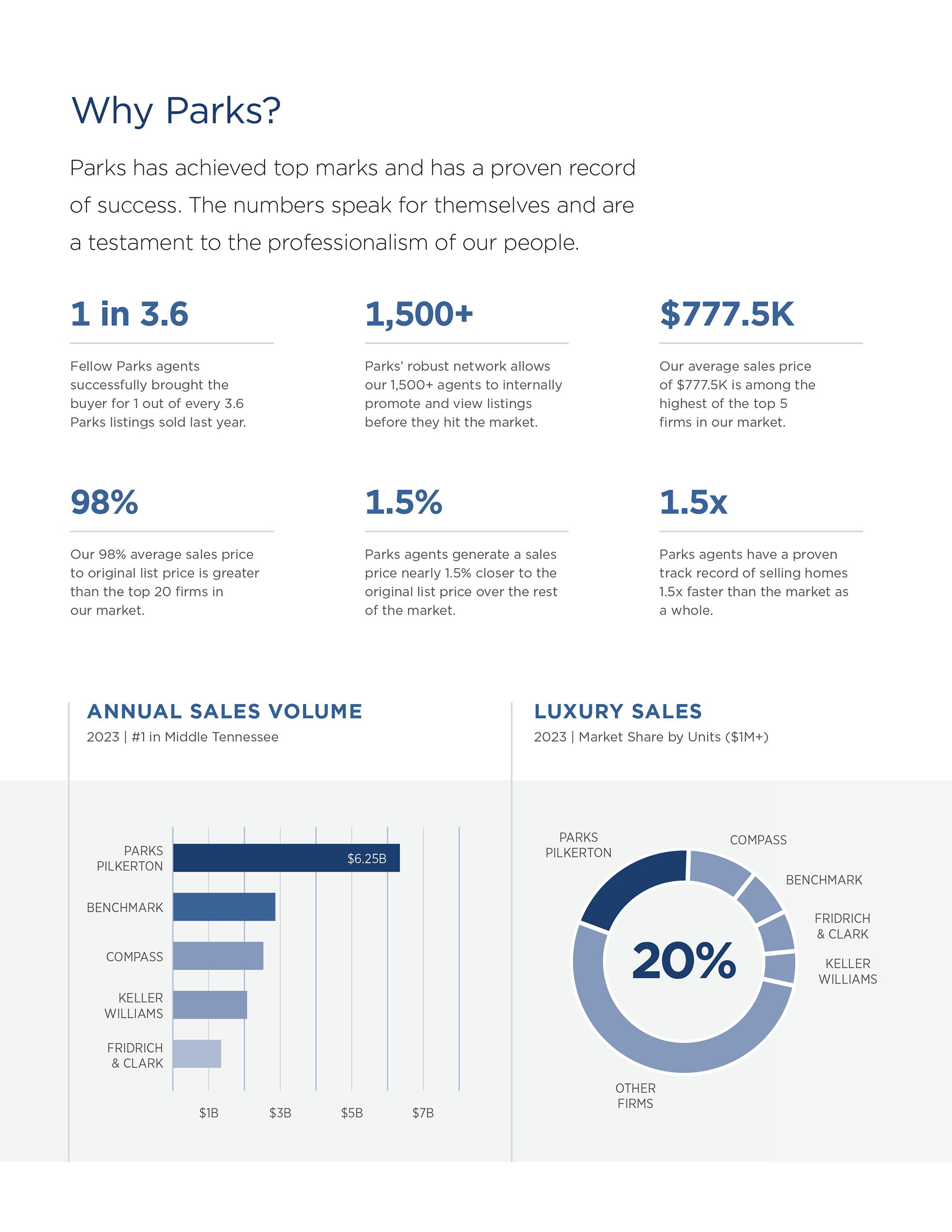 At the time of its acquisition in 2024, Parks had grown to hold the largest market share in the Greater Nashville market, with more than 1,500+ agents and 10 offices, out-competing national brands.
